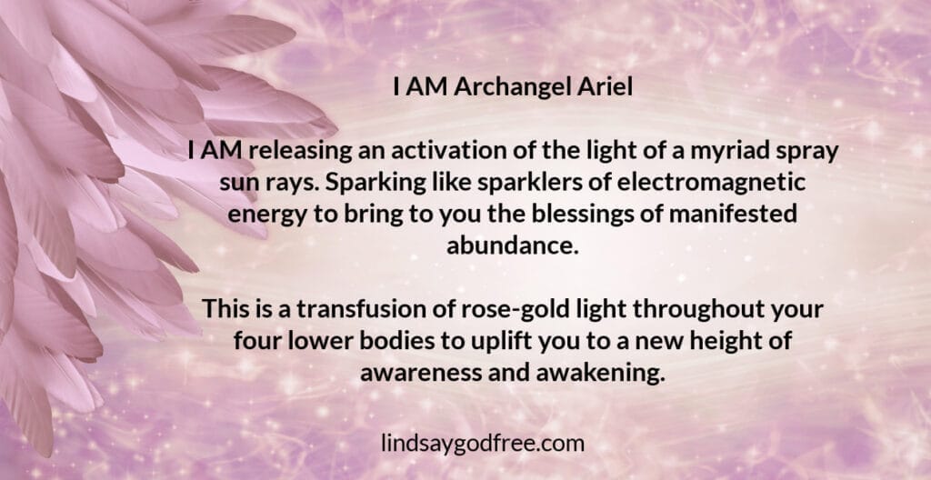 Good day, I AM the Archangel Ariel. It is my pleasure to talk with you at this time about abundance. I am connected to Earth’s energy and the abundance of this energy manifesting all around you and through you.