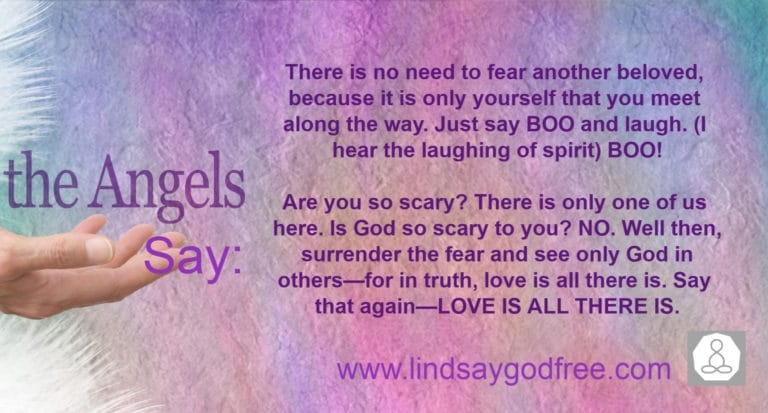 Are you so scary? There is only one of us here. Is God so scary to you? NO. Well then, surrender the fear and see only God in others—for in truth, love is all there is. Say that again—LOVE IS ALL THERE IS.