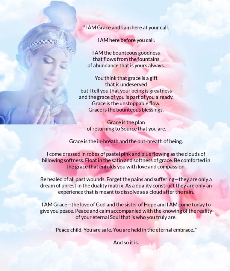 I AM Grace—the love of God and the sister of Hope and I AM come today to give you peace. Peace and calm accompanied with the knowing of the reality of your eternal Soul that is who you truly are.