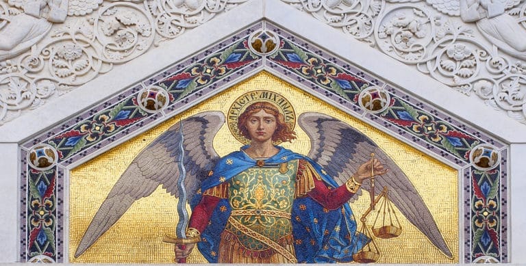 One of the beautiful colored mosaics on the external wall of the Serbian-Orthodox Church in the center of Trieste.