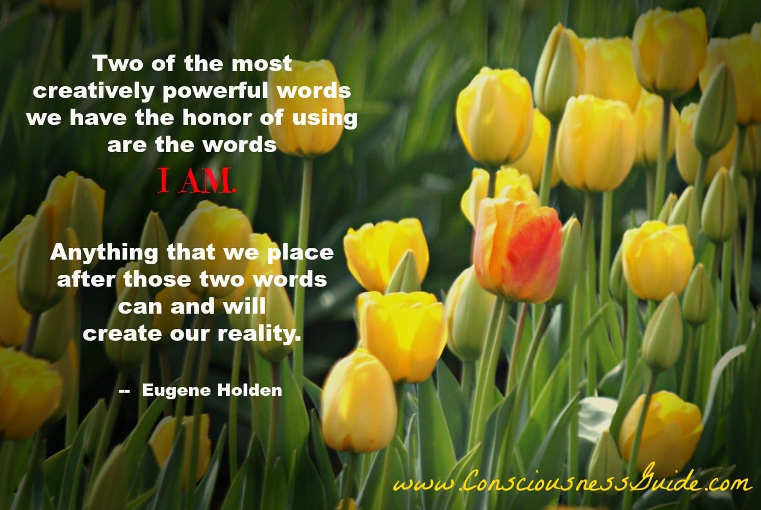 Two of the most creatively powerful words we have the honor of using are the words I AM. Anything that we place after those two words can and will create our reality. — Eugene Holden